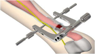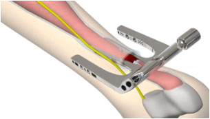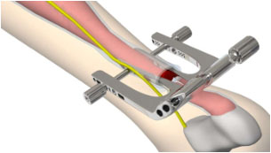 3、將骨科定位片(不帶各個(gè)導(dǎo)向筒)內(nèi)側(cè)臂插入跟腱筋膜鞘內(nèi),剛插入時(shí)兩內(nèi)側(cè)臂距離很小,插入過程中兩內(nèi)側(cè)臂距離通過主體連接桿逐漸增大,使跟腱位于兩內(nèi)側(cè)臂之間。如圖2所示。