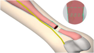 5、沿鉤針旋入導(dǎo)向筒,使導(dǎo)向筒遠(yuǎn)端進(jìn)入骨科定位片內(nèi)臂,撤出鉤針,完成縫合通道的建立。如圖4所示。