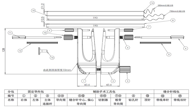 微創(chuàng)跟腱斷裂通道吻合器為II類醫(yī)療器械,產(chǎn)品規(guī)格型號(hào):GJQX-A;組成:固定導(dǎo)向包 + 輔助手術(shù)工具包 + 縫合針線包,固定導(dǎo)向包內(nèi)部件為固定器,由聚碳酸酯材質(zhì)的左體、右體和主體連接桿組裝而成。輔助手術(shù)工具包內(nèi)部件為輔助手術(shù)工具件,為316L不銹鋼件??p合針線包內(nèi)部件為縫合針,包含一個(gè)帶線雙針和一個(gè)帶線單針。縫合針為圓直形針,3Cr13不銹鋼材質(zhì),;縫合線為綠色、合成纖維(聚酯)、多股編織、有涂層Ⅰ類縫線 ;
